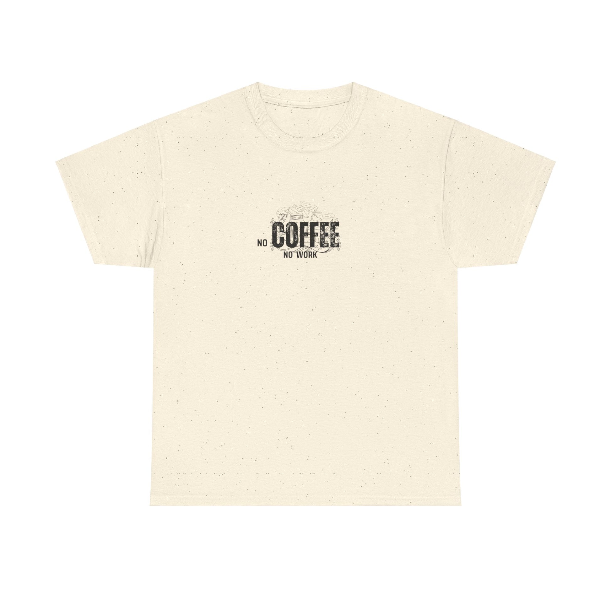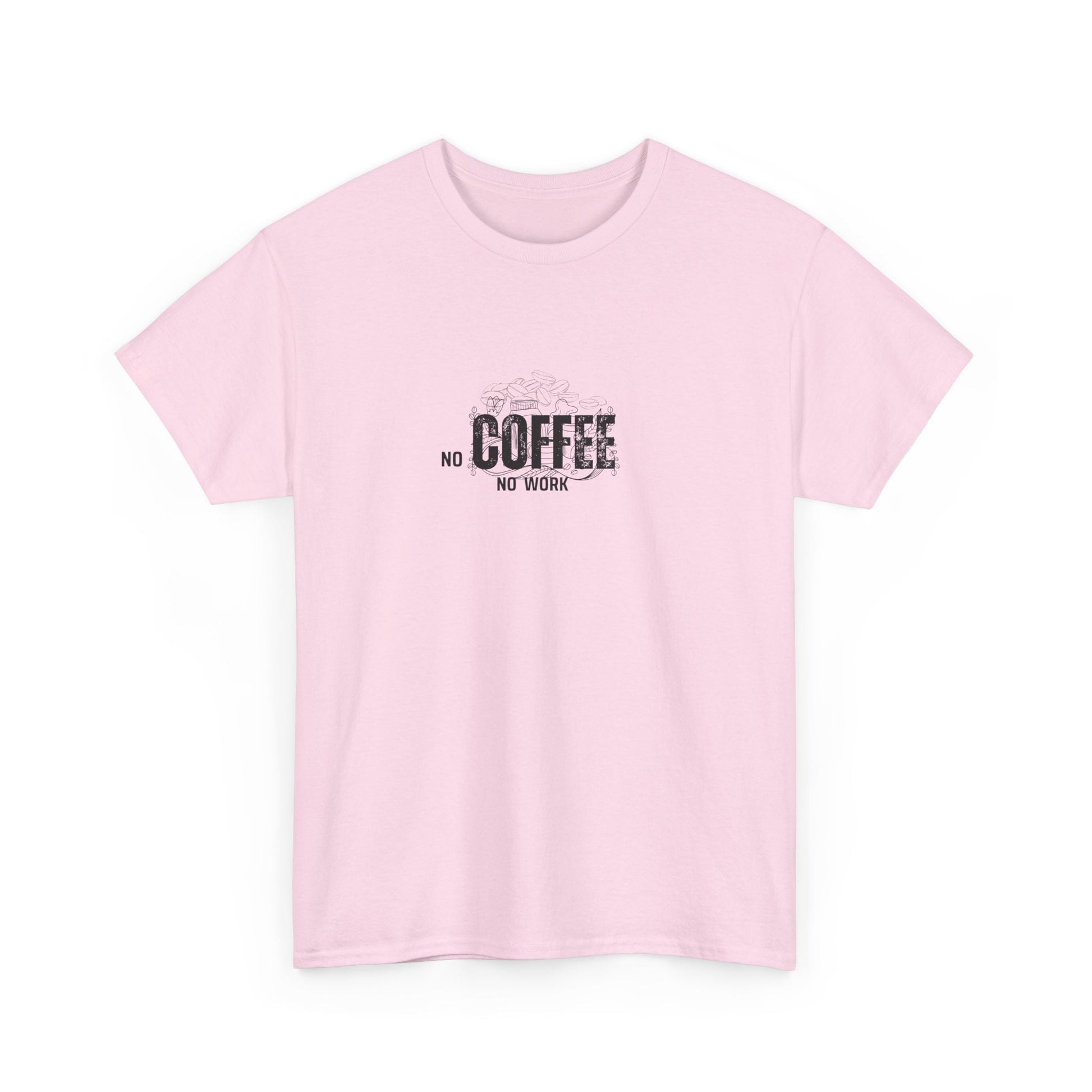 A unisex heavy cotton t-shirt with a funny "no coffee, no work" quote print. Perfect for coffee lovers who want to add some humor to their wardrobe. Ideal for casual wear or as a gift for coffee enthusiasts. Relevant for casual Fridays, coffee-themed events, and everyday wear.