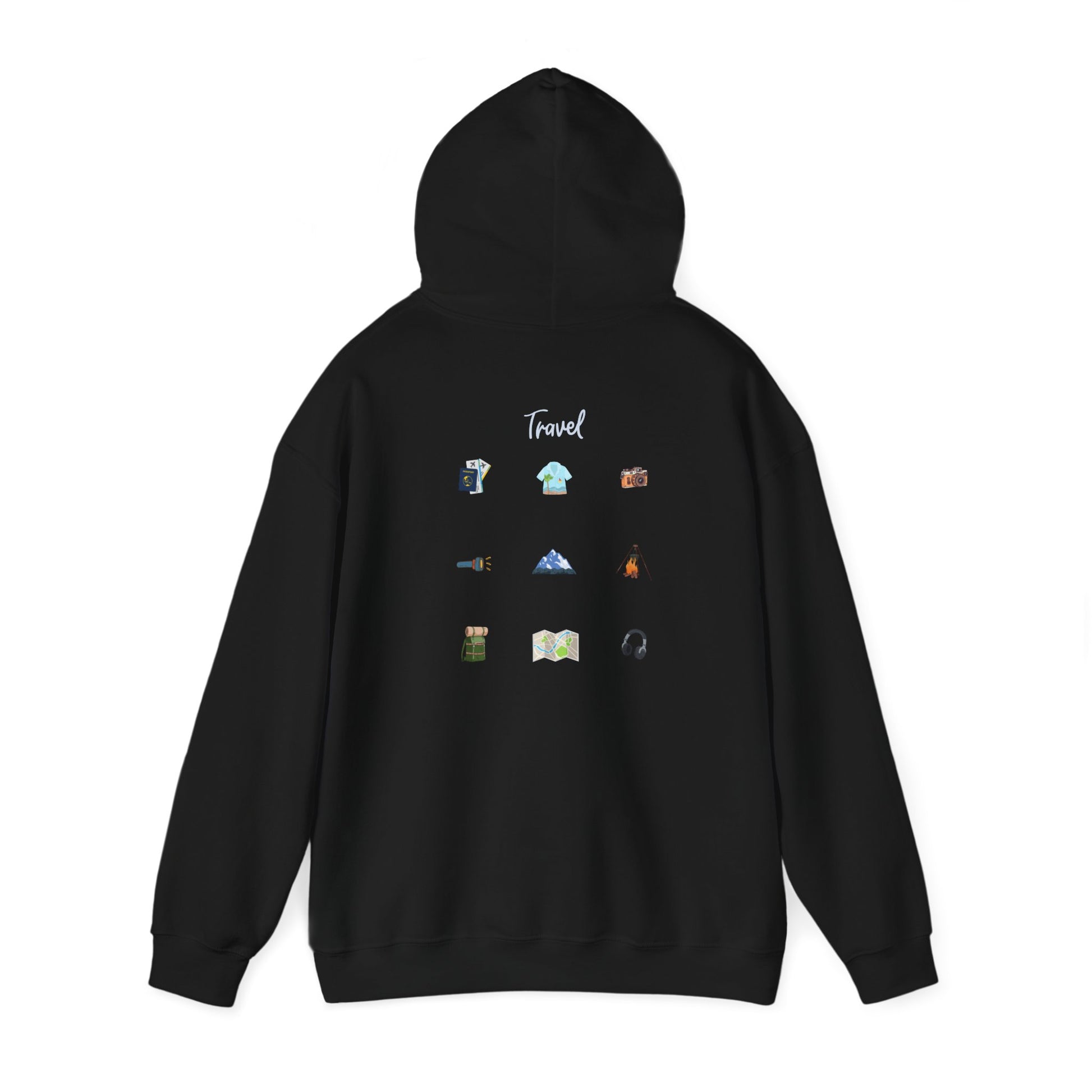 A travel theme hoodie designed with meaningful icons, perfect for those who love to explore the world and seek adventure. This cozy and stylish hoodie with a kangaroo pouch pocket and adjustable hood is ideal for adults looking for a comfortable and warm garment to wear during their travels or everyday life. Great for gifting on birthdays, holidays, or any special occasion.